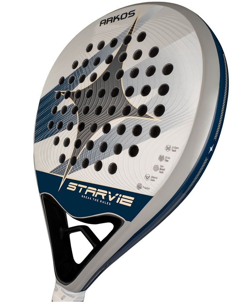 L'un des atouts majeurs de la raquette Starvie Arkos réside dans sa surface en fibre X-glass Tech, qui offre une élasticité accrue et une sortie de balle fluide. Le caoutchouc S-Eva Flex, à densité souple, complète ce revêtement en assurant un confort et une réactivité optimaux, facilitant ainsi la progression du joueur. Ces éléments, associés à une conception de haute qualité, permettent d'atteindre un équilibre parfait entre confort, contrôle et stabilité, contribuant à réduire l'effort à chaque mouvement.